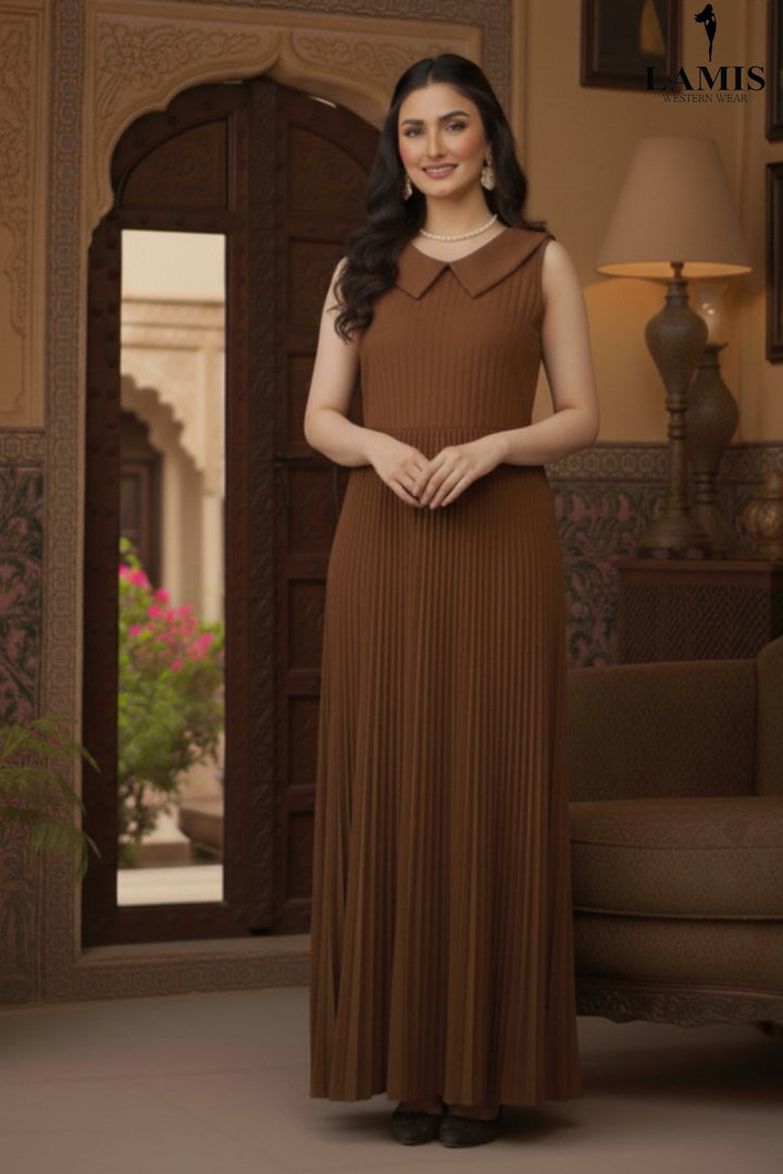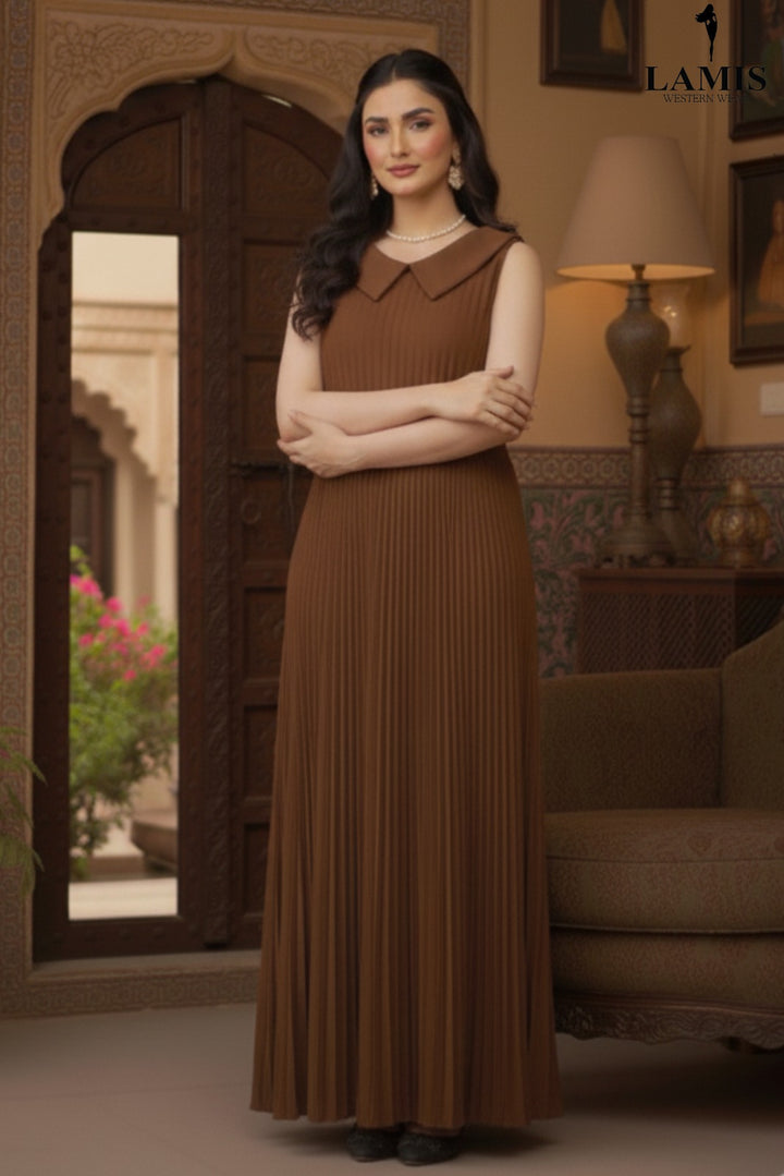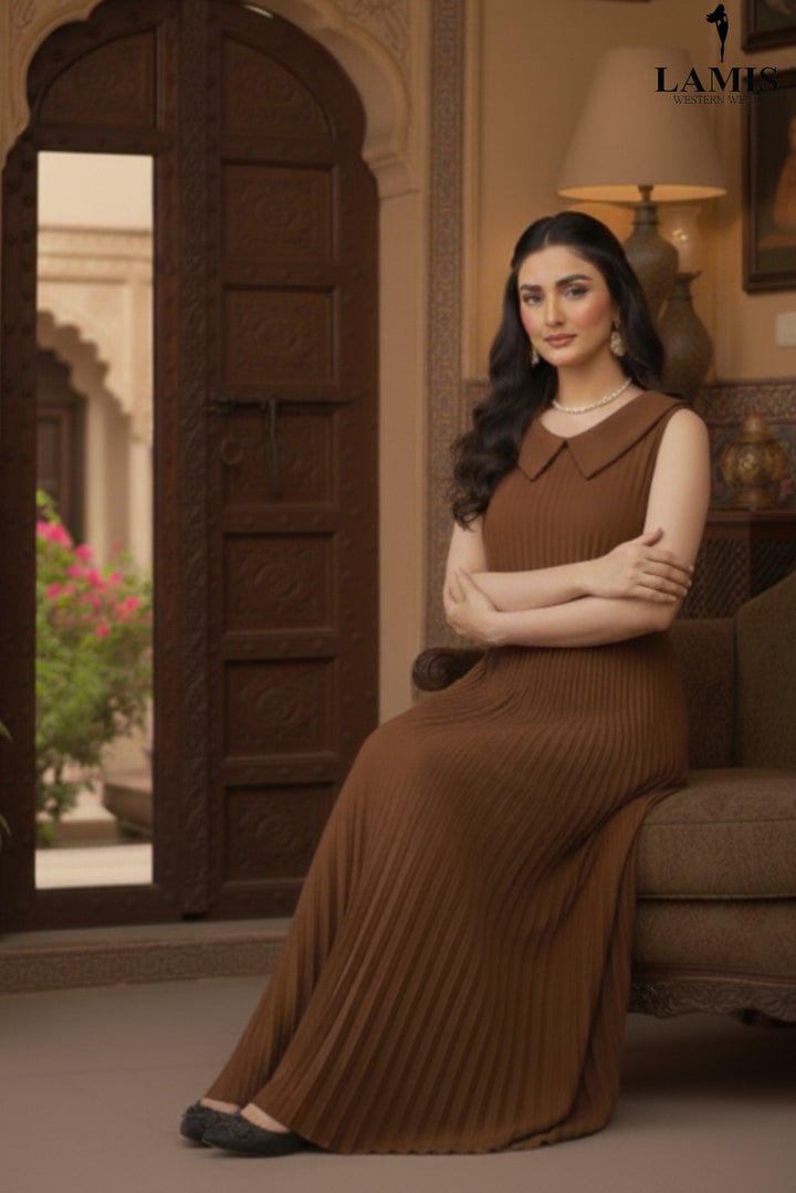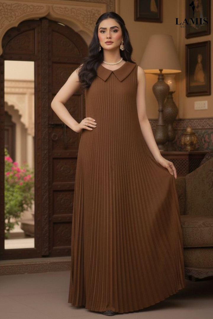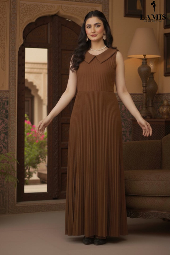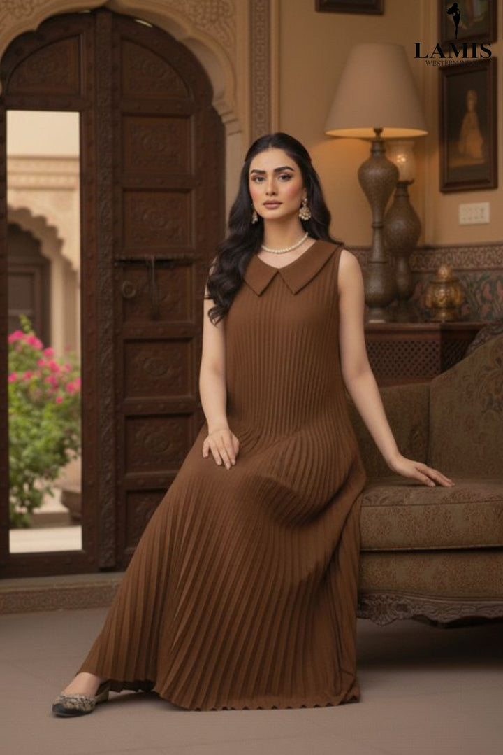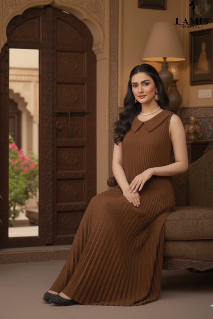 Step into sophistication with our Luxe Pleat Maxi Dress. This stunning piece features a finely pleated texture from the waist down, creating beautiful movement and an effortlessly graceful silhouette. The chic, contrasting peter pan collar adds a touch of vintage charm and polished appeal, making this an essential dress for both formal and semi-formal occasions.