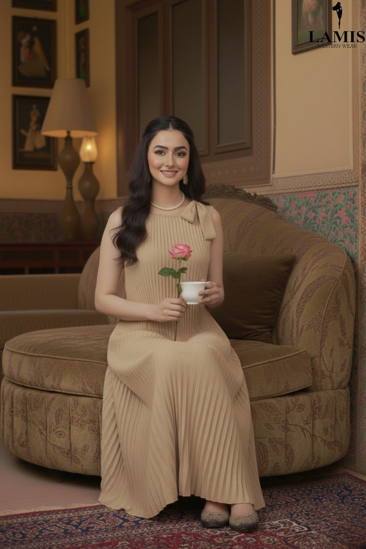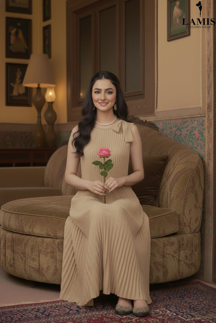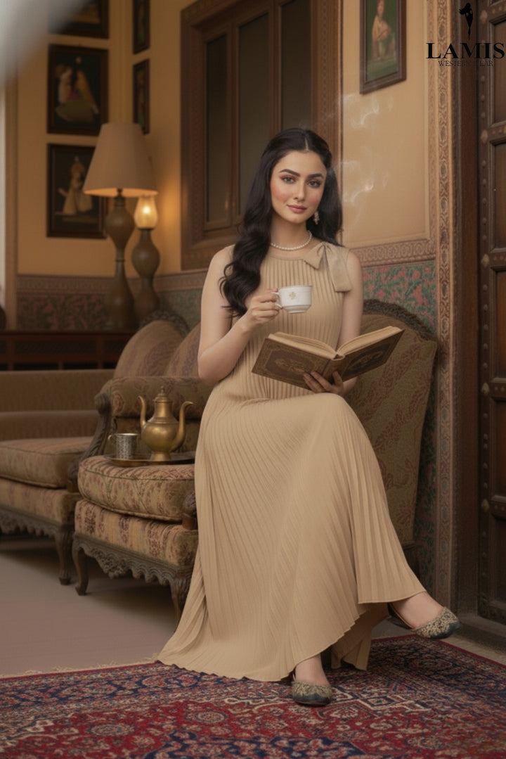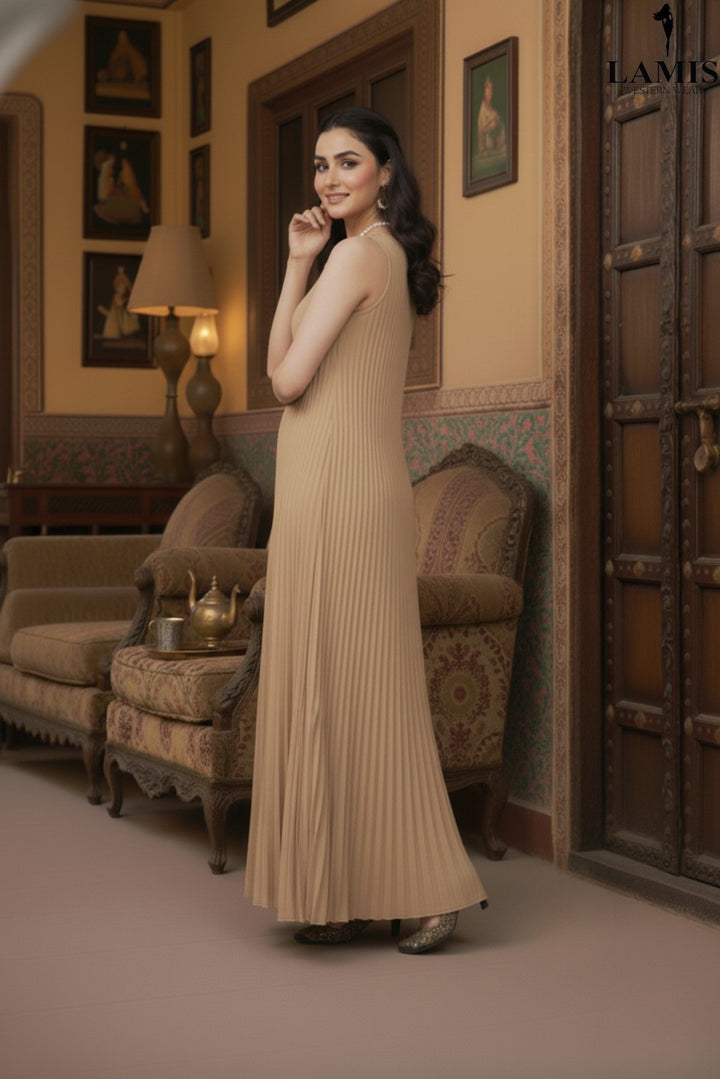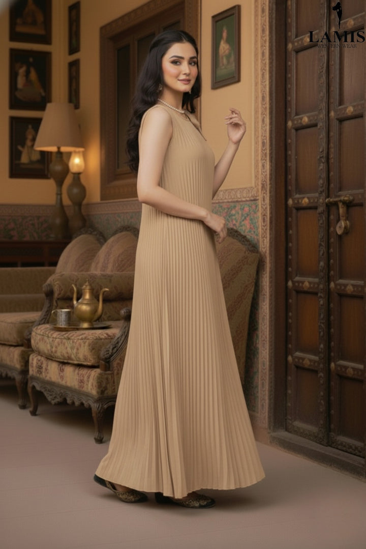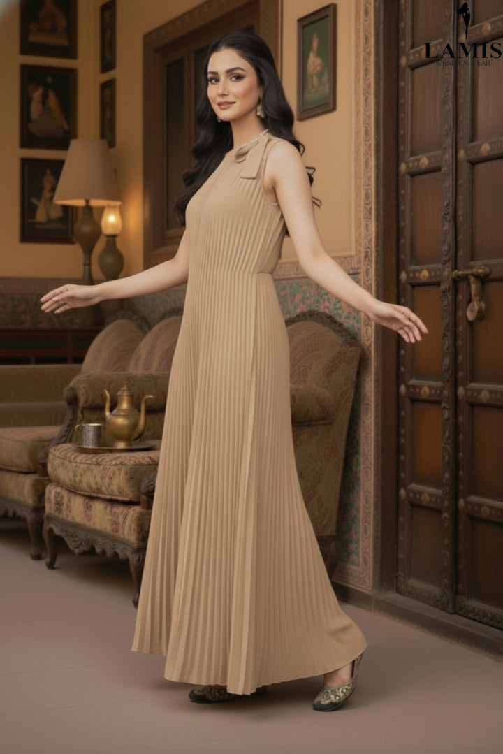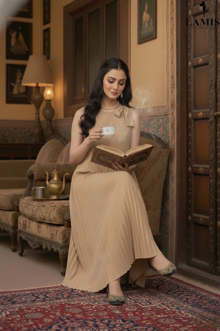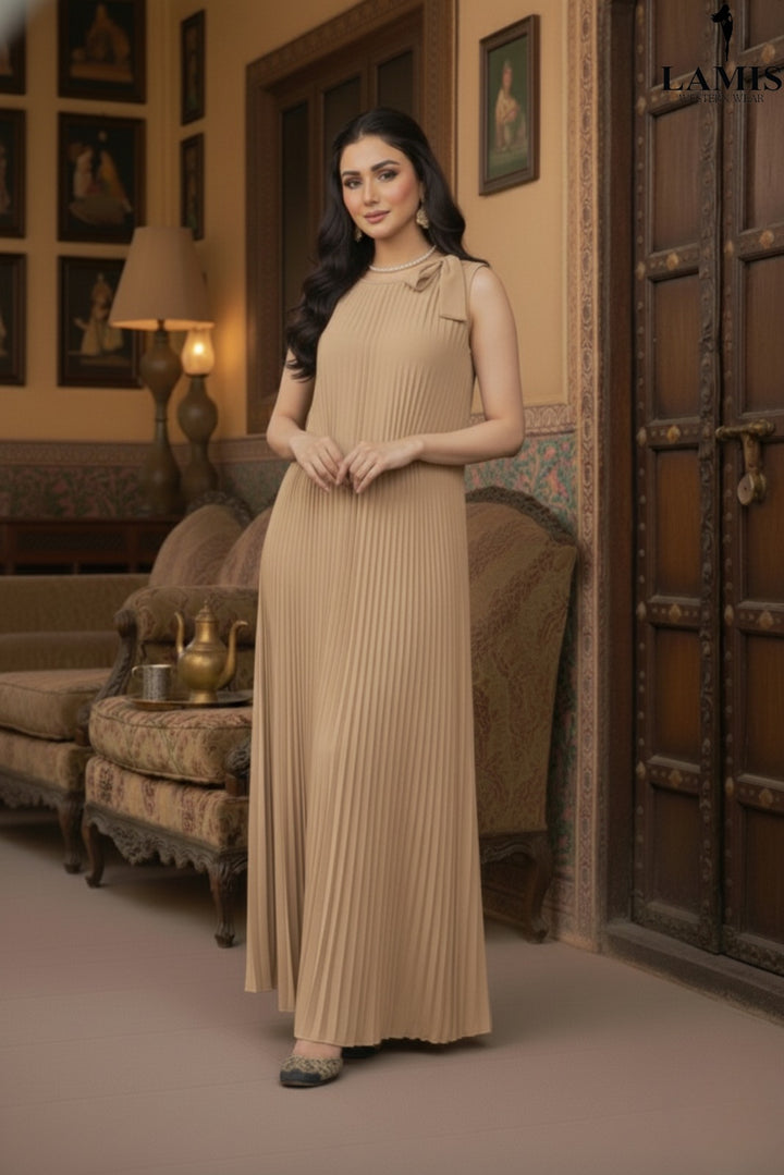 Step into sophistication with our Luxe Pleat Maxi Dress. This stunning piece features a finely pleated texture from the waist down, creating beautiful movement and an effortlessly graceful silhouette. The chic, contrasting peter pan collar adds a touch of vintage charm and polished appeal, making this an essential dress for both formal and semi-formal occasions.